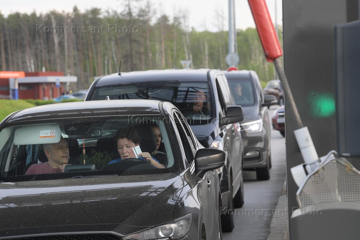 Москва во время режима самоизоляции из-за опасности распространения коронавирусной инфекции COVID-19. Жанровая фотография. Автомобили в очереди на оплату проезда на пункте взимания платы (ПВП) на платной автомобильной дороге.