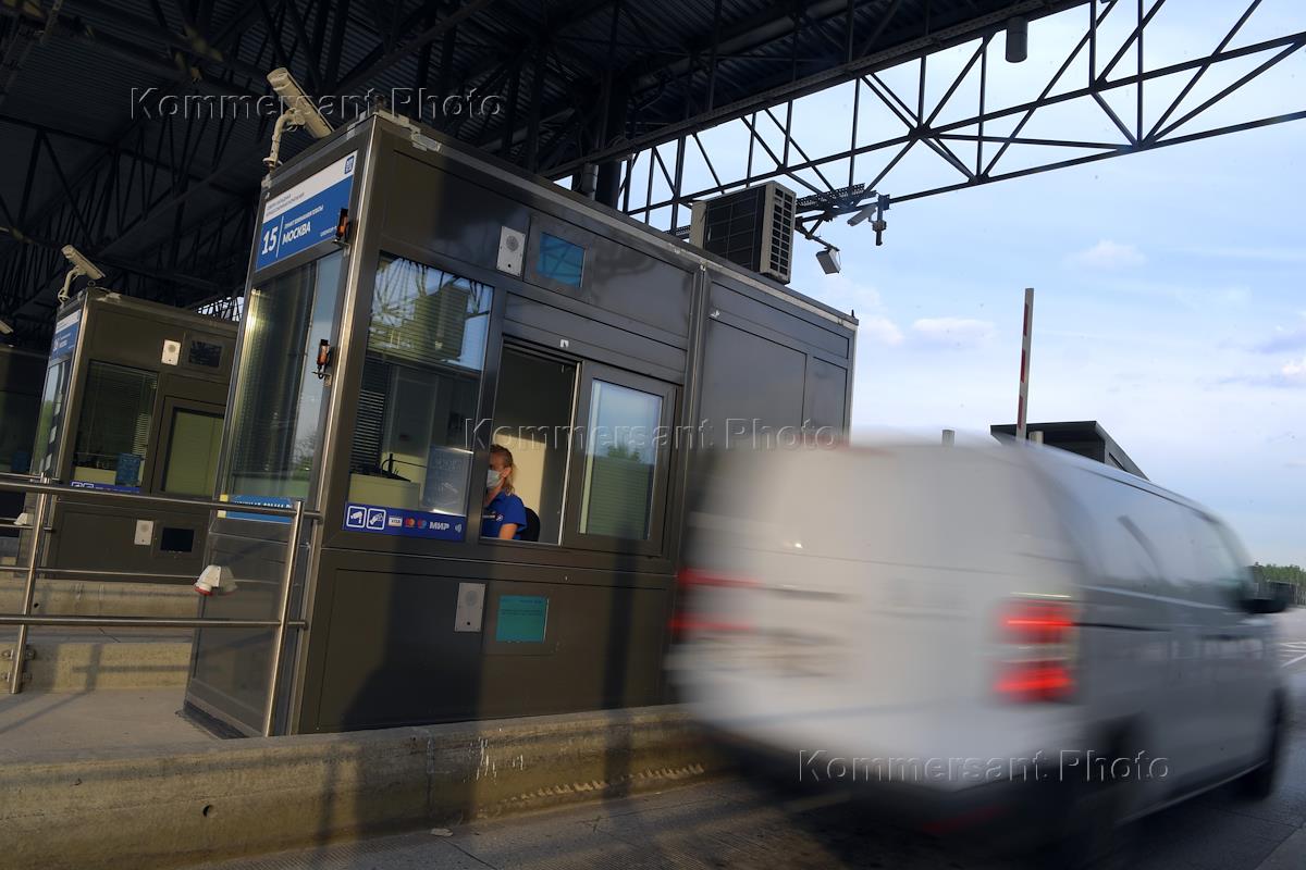 Москва во время режима самоизоляции из-за опасности распространения коронавирусной инфекции COVID-19. Жанровая фотография. Автомобили на пункте взимания платы (ПВП) на платной автомобильной дороге.