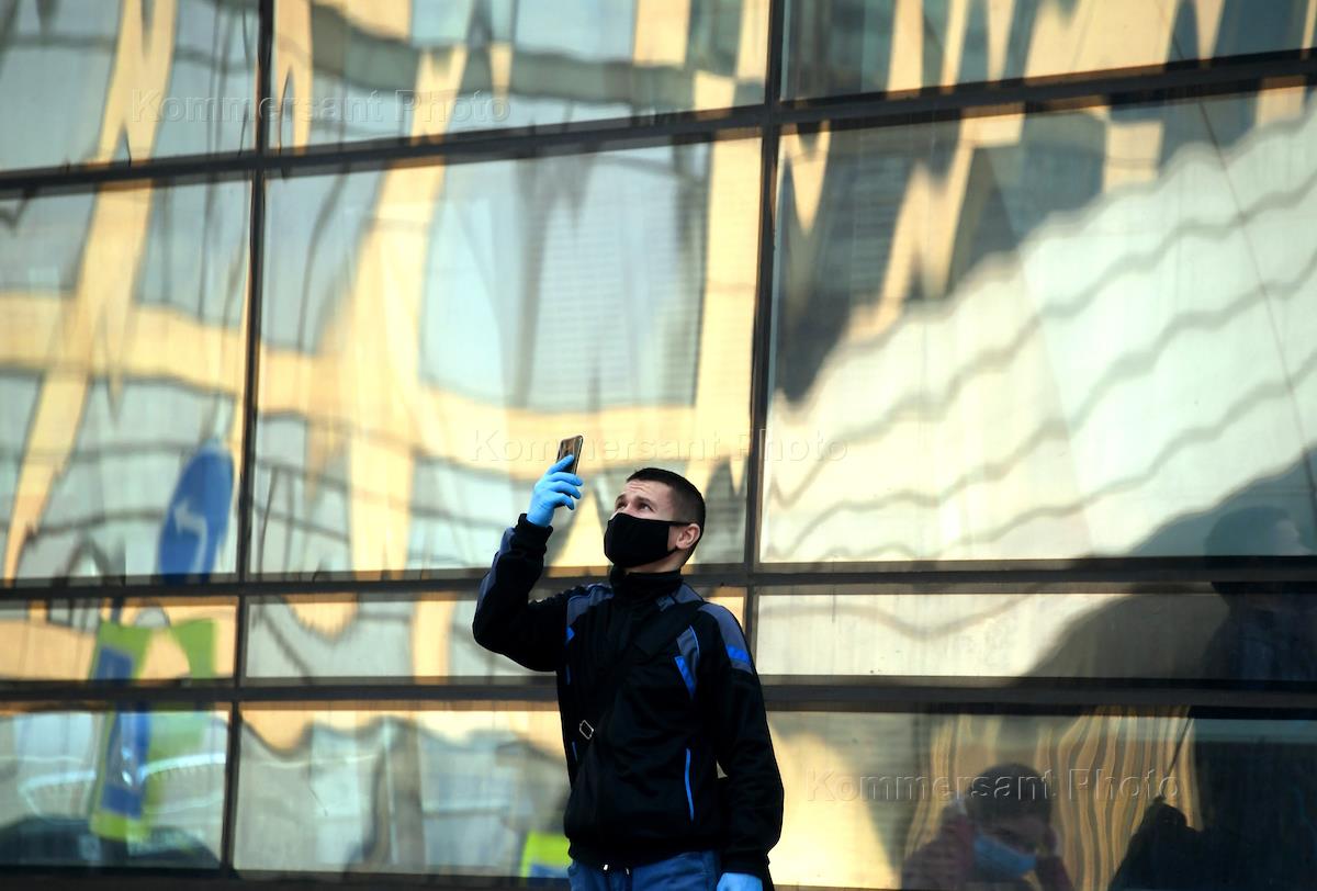 Москва во время режима самоизоляции из-за опасности распространения коронавирусной инфекции COVID-19. Жанровая фотография. Мужчина в медицинской маске делает селфи на фоне стеклянного фасада здания на территории Московского международного делового центра (ММДЦ) "Москва-сити".