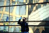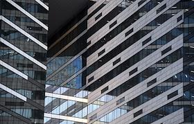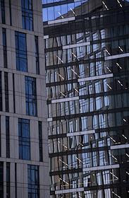 Москва во время режима самоизоляции из-за опасности распространения коронавирусной инфекции COVID-19. Жанровая фотография. Отражение зданий в стеклянном фасаде здания на территории Московского международного делового центра (ММДЦ) "Москва-сити".
