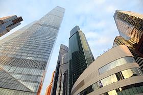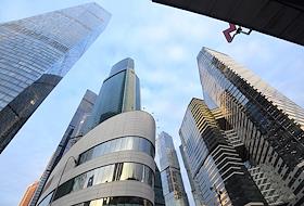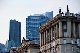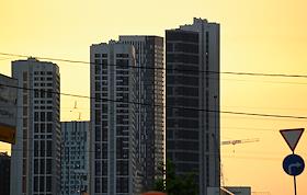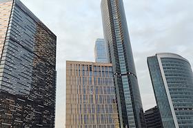 Москва во время режима самоизоляции из-за опасности распространения коронавирусной инфекции COVID-19. Жанровая фотография. Фасады зданий на территории Московского международного делового центра (ММДЦ) "Москва-сити".
