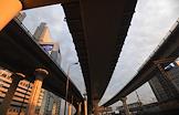 Москва во время режима самоизоляции из-за опасности распространения коронавирусной инфекции COVID-19. Жанровая фотография. Вид на комплекс многоэтажных зданий из-под автомобильной эстакады.