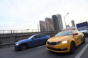 Москва во время режима самоизоляции из-за опасности распространения коронавирусной инфекции COVID-19. Жанровая фотография. Автомобили во время движения по мосту на фоне комплекса многоэтажных зданий.