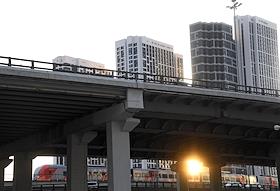Москва во время режима самоизоляции из-за опасности распространения коронавирусной инфекции COVID-19. Жанровая фотография. Строящийся путепровод на фоне высотных офисных зданий.