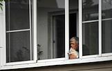 Москва во время режима самоизоляции из-за опасности распространения коронавирусной инфекции COVID-19. Жанровая фотография. Пожилой мужчина с собачкой смотрит на улицу с балкона своей квартиры.