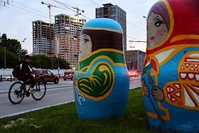 Москва во время режима самоизоляции из-за опасности распространения коронавирусной инфекции COVID-19. Жанровая фотография. Матрешки на обочине дороги на фоне строящихся домов.