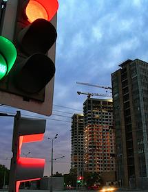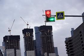 Москва во время режима самоизоляции из-за опасности распространения коронавирусной инфекции COVID-19. Жанровая фотография. Светофор на фоне строящегося комплекса многоэтажных зданий.