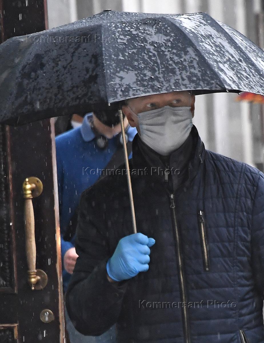 Москва во время режима самоизоляции из-за опасности распространения коронавирусной инфекции COVID-19. Жанровая фотография. Мужчина в медицинской маске и перчатках под зонтом во время дождя.