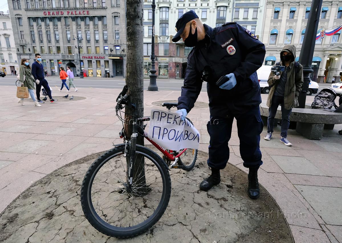 Серия одиночных пикетов у Гостиного двора в поддержку журналистов Ильи Азара, Татьяны Фельгенгауэр, Александра Плющева, Сергея Смирнова, Виктории Ивлевой. Сотрудник полиции срывает плакат с велосипеда, на котором написано: "Прекратите произвол".