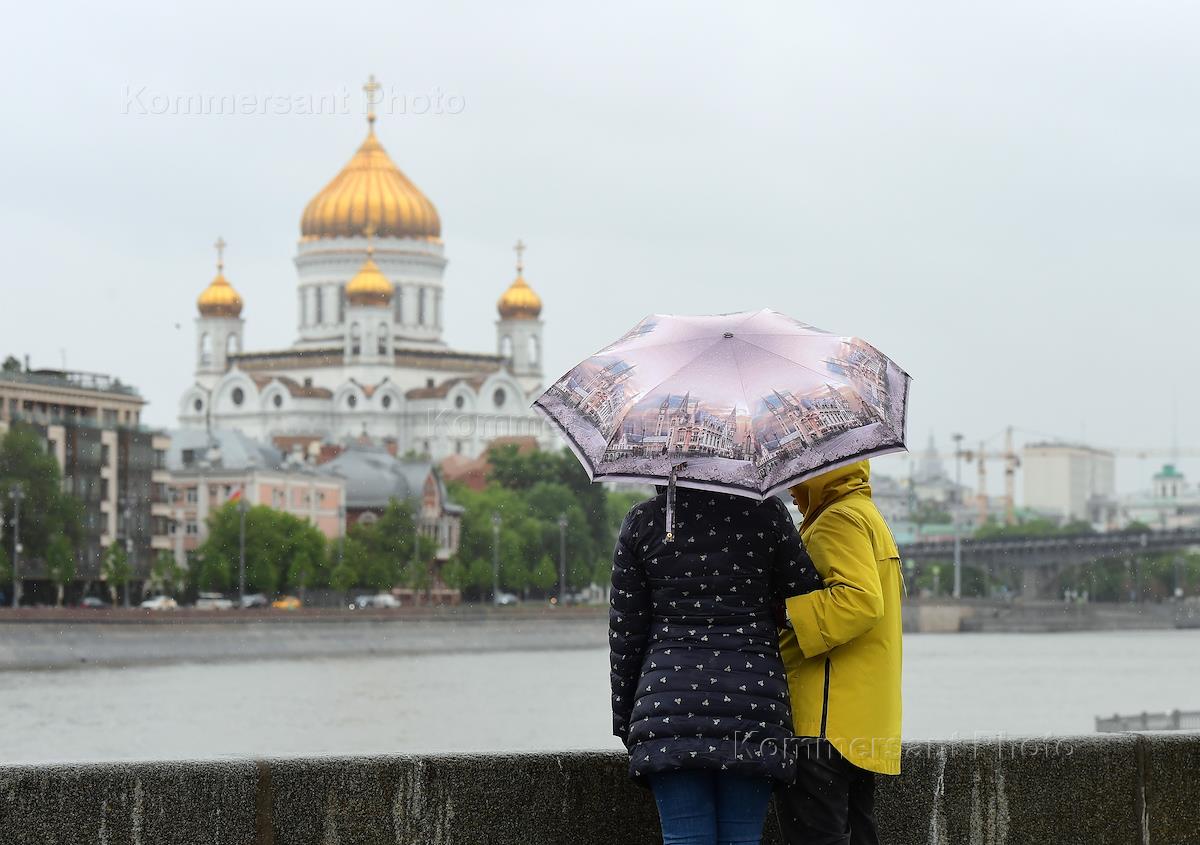 Москва во время режима самоизоляции из-за опасности распространения коронавирусной инфекции COVID-19. Начало второго этапа снятия ограничений, введенных в связи с эпидемией коронавируса. Жанровая фотография. Девушка под зонтом гуляет по набережной парка.