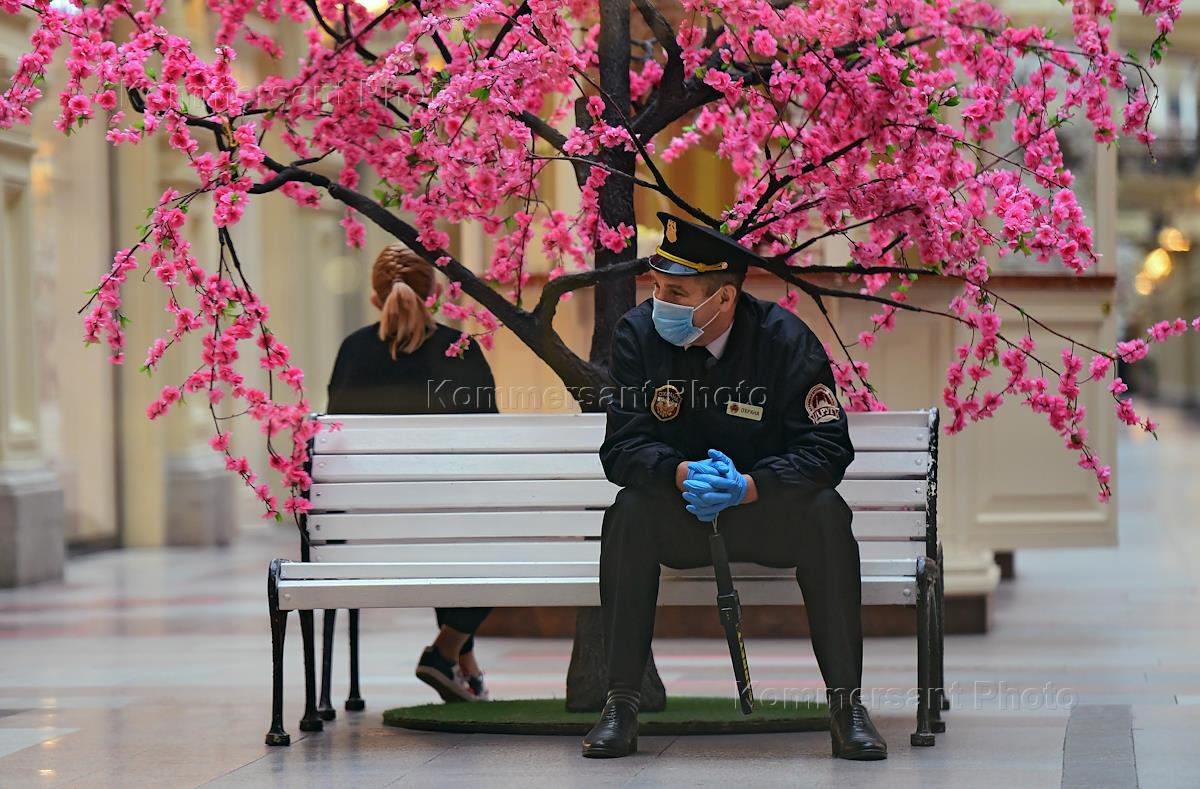 Moscow during self-isolation regime caused by the danger of the coronavirus COVID-19 spread. The beginning of the second stage of removing coronavirus restrictions. Genre photo. GUM security guard wearing face mask.