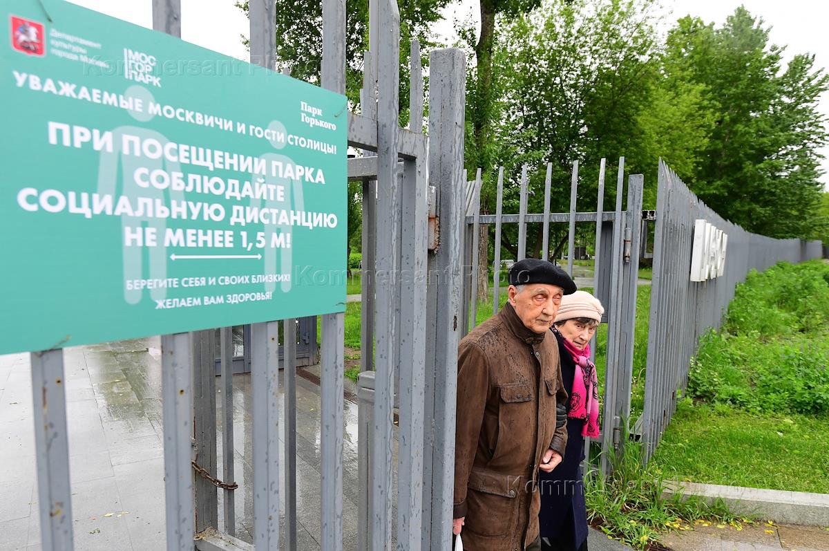 Moscow during self-isolation regime caused by the danger of the coronavirus COVID-19 spread. The beginning of the second stage of removing coronavirus restrictions. Genre photo. Elderly people walk in the park.
