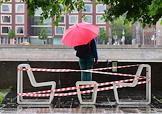 Москва во время режима самоизоляции из-за опасности распространения коронавирусной инфекции COVID-19. Начало второго этапа снятия ограничений, введенных в связи с эпидемией коронавируса. Жанровая фотография. Женщина под зонтом перед входом в Парк Горького.