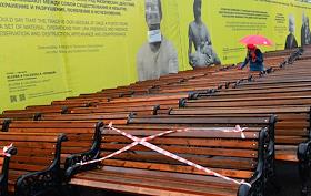 Москва во время режима самоизоляции из-за опасности распространения коронавирусной инфекции COVID-19. Начало второго этапа снятия ограничений, введенных в связи с эпидемией коронавируса. Жанровая фотография. Ряды скамеек с заградительной лентой в парке.
