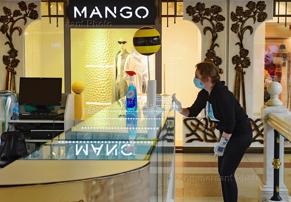 Москва во время режима самоизоляции из-за опасности распространения коронавирусной инфекции COVID-19. Начало второго этапа снятия ограничений, введенных в связи с эпидемией коронавируса. Жанровая фотография. Сотрудница в медицинской маске во время подготовки магазина к открытию в торговом центре "Охотный ряд".