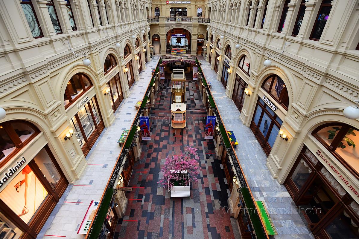 Moscow during self-isolation regime caused by the danger of the coronavirus COVID-19 spread. The beginning of the second stage of removing coronavirus restrictions. Genre photo. Boutique arcade in GUM.