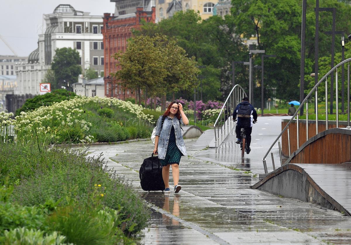 Moscow during self-isolation regime caused by the danger of the coronavirus COVID-19 spread. Genre photo. People walk in the park during rain.