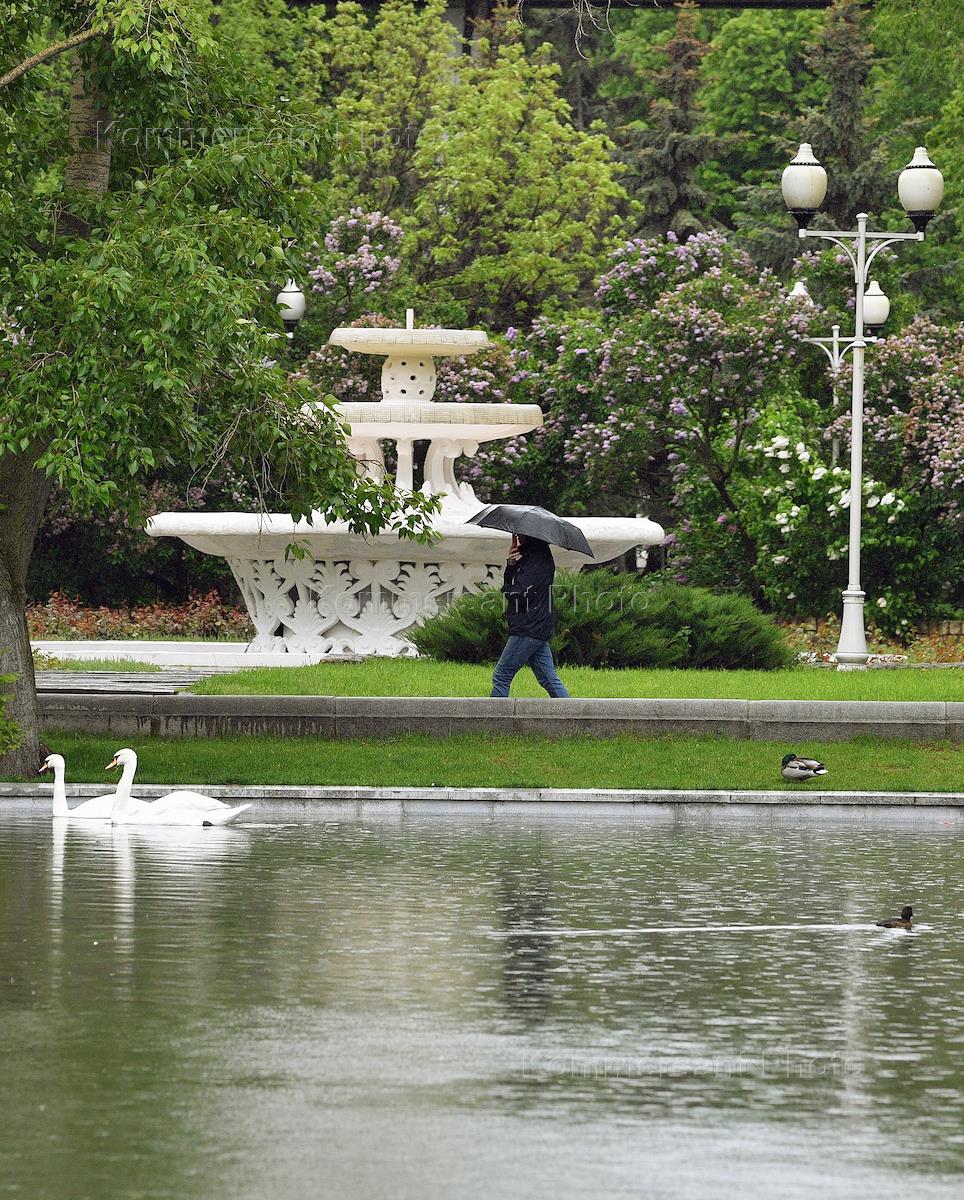 Moscow during self-isolation regime caused by the danger of the coronavirus COVID-19 spread. Genre photo. People walk in the park during rain.