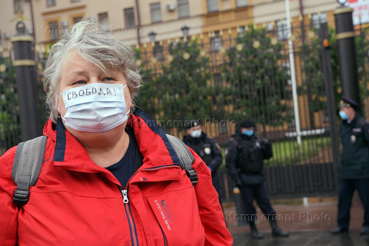 Woman holds a one-person protest demanding the release of journalist Ilya Azar at the building of the Main Directorate of the Ministry of Internal Affairs of Russia for the city of Moscow. Journalist Ilya Azar was arrested for 15 days after holding one-person protest on May 26 in support of founder of Police Ombudsman public page Vladimir Vorontsov.