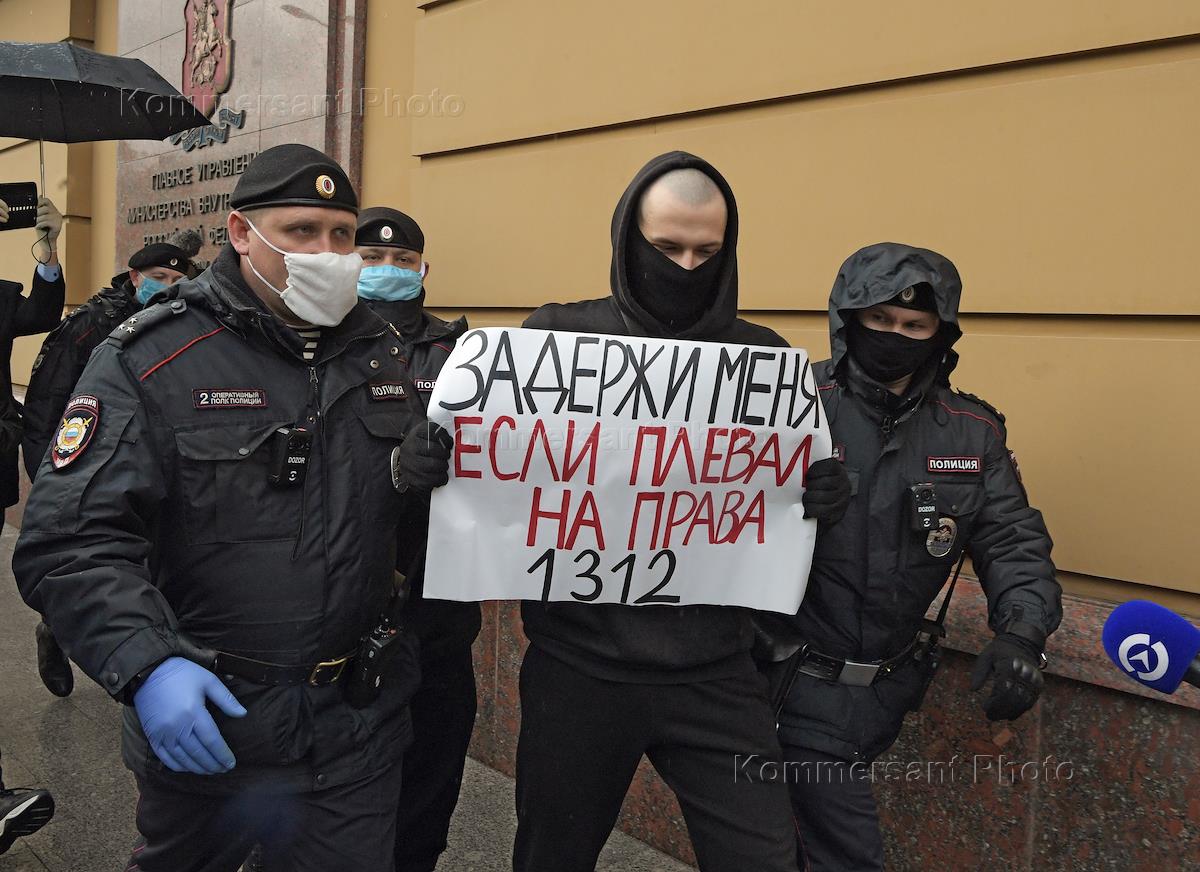 Man holds a one-person protest demanding the release of journalist Ilya Azar at the building of the Main Directorate of the Ministry of Internal Affairs of Russia for the city of Moscow. Journalist Ilya Azar was arrested for 15 days after holding one-person protest on May 26 in support of founder of Police Ombudsman public page Vladimir Vorontsov.
