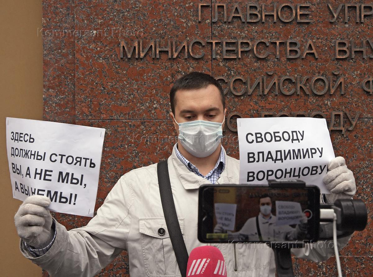 Man holds a one-person protest demanding the release of journalist Ilya Azar at the building of the Main Directorate of the Ministry of Internal Affairs of Russia for the city of Moscow. Journalist Ilya Azar was arrested for 15 days after holding one-person protest on May 26 in support of founder of Police Ombudsman public page Vladimir Vorontsov.