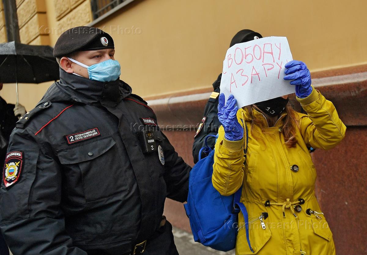 Series of one-person protests demanding the release of journalist Ilya Azar at the building of the Main Directorate of the Ministry of Internal Affairs of Russia for the city of Moscow. Journalist Ilya Azar was arrested for 15 days after holding one-person protest on May 26 in support of founder of Police Ombudsman public page Vladimir Vorontsov. Police officers detain Open Russia coordinator Tatyana Usmanova (center).