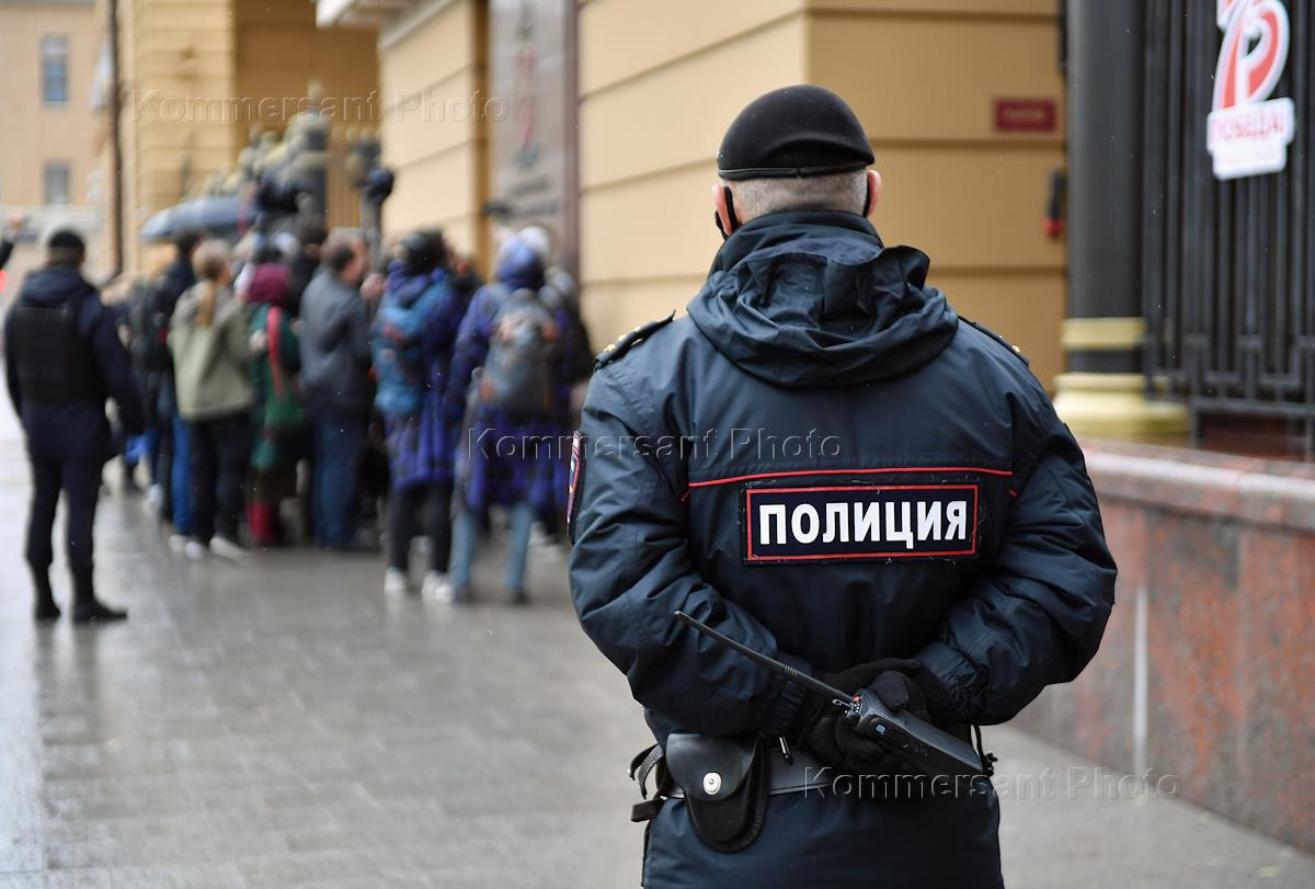 Series of one-person protests demanding the release of journalist Ilya Azar at the building of the Main Directorate of the Ministry of Internal Affairs of Russia for the city of Moscow. Journalist Ilya Azar was arrested for 15 days after holding one-person protest on May 26 in support of founder of Police Ombudsman public page Vladimir Vorontsov. Police officers take the cardboard figure of Ilya Azar from the street.