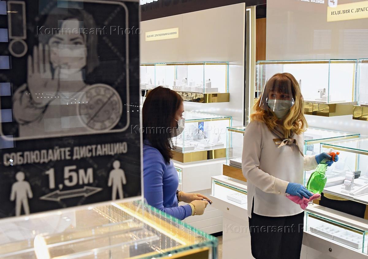 Moscow during self-isolation regime caused by the danger of the coronavirus COVID-19 spread. Moscow malls reopen. The beginning of the second stage of removing coronavirus restrictions. Genre photo. Jewellery store saleswoman wearing face mask and face shield works in the reopened Evropeyskiy Shopping Mall.
