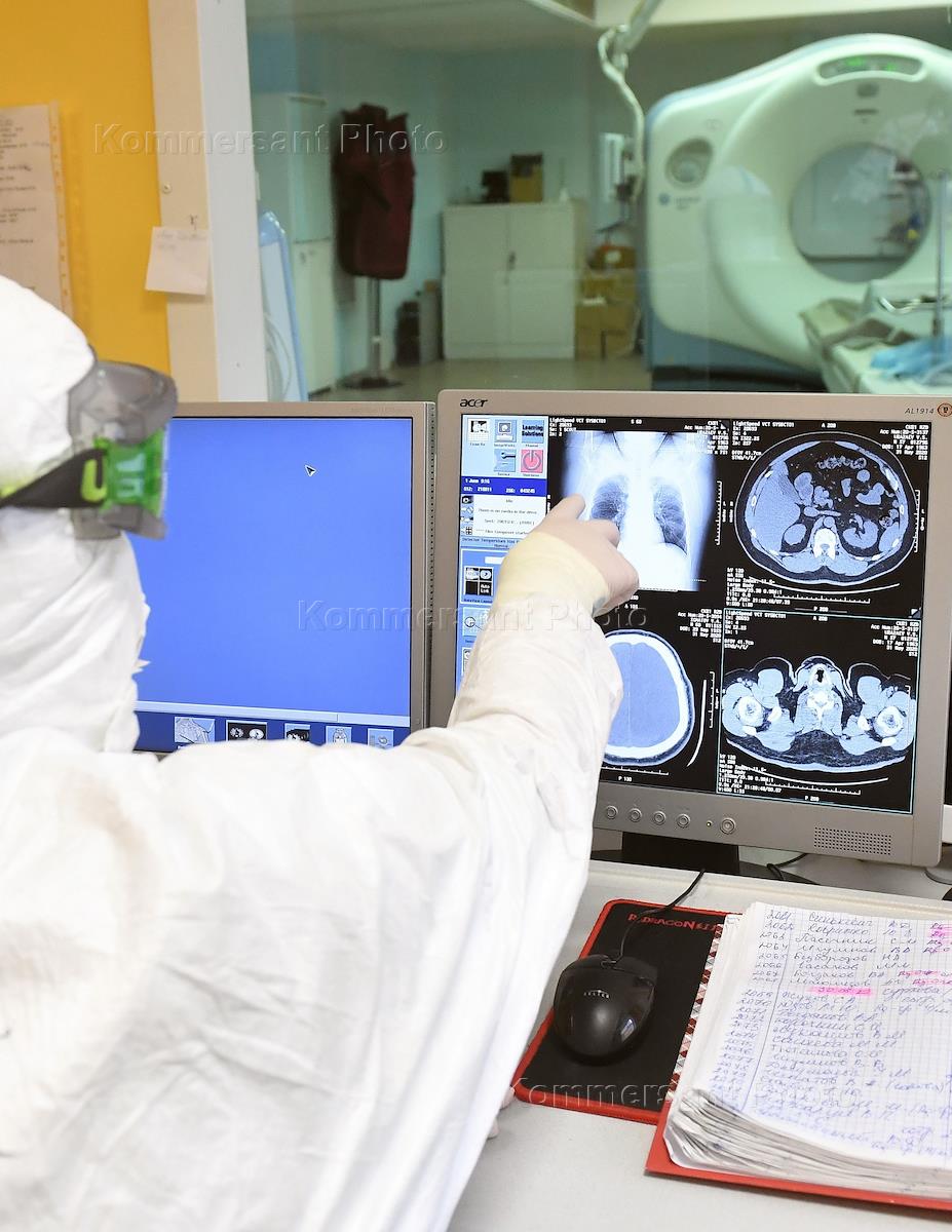 Лечение больных с коронавирусной инфекцией COVID-19 в центральной клинической больнице "РЖД-Медицина". Медицинский работник в защитном костюме во время подготовки к исследованию больного на аппарате компьютерной томографии.