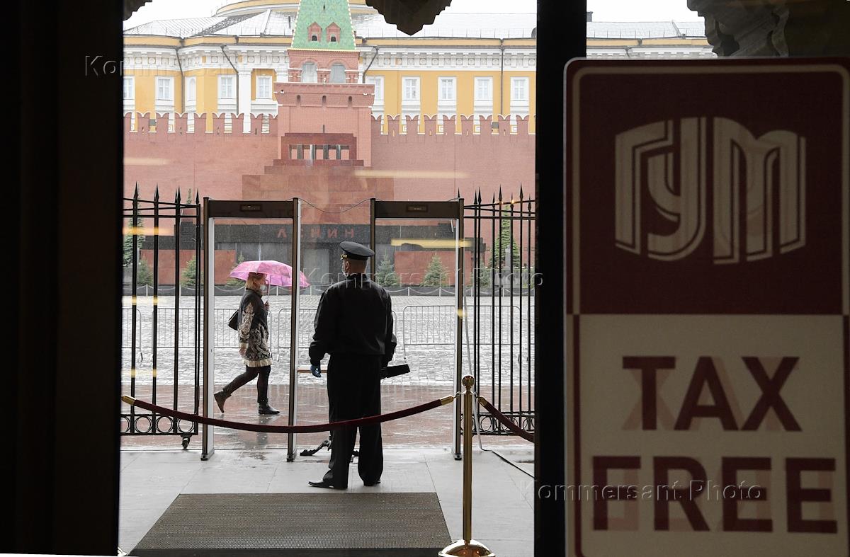 Москва во время режима самоизоляции из-за опасности распространения коронавирусной инфекции COVID-19. Начало второго этапа снятия ограничений, введенных в связи с эпидемией коронавируса. Жанровая фотография. Входная дверь в открывшийся торговый центр ГУМ.