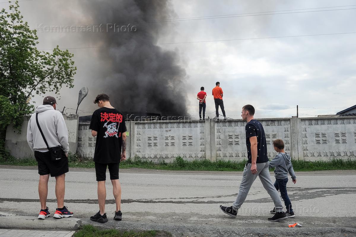 Новосибирск во время режима карантина из-за опасности распространения коронавирусной инфекции COVID-19. Крупный пожар на складе в Заельцовском районе на улице Гипсовая. Жанровая фотография.