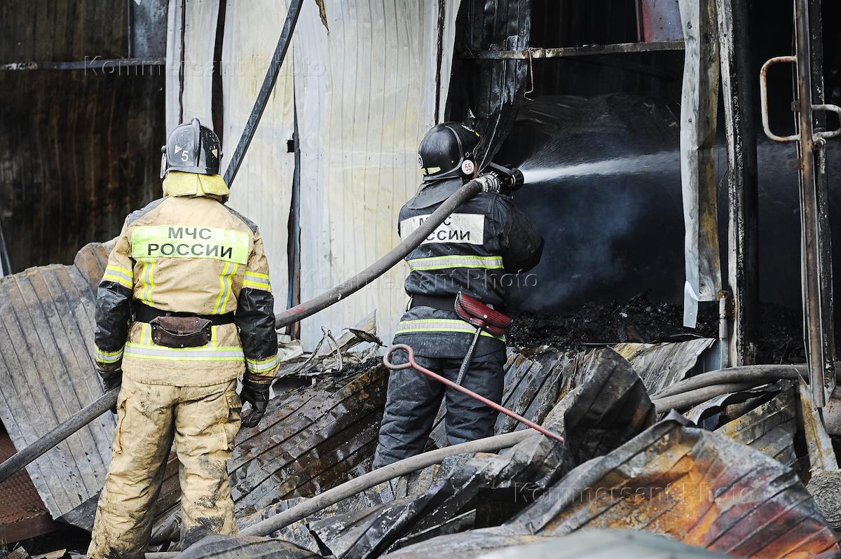Новосибирск во время режима карантина из-за опасности распространения коронавирусной инфекции COVID-19. Крупный пожар на складе в Заельцовском районе на улице Гипсовая. Жанровая фотография. Сотрудники МЧС России во время ликвидации пожара.