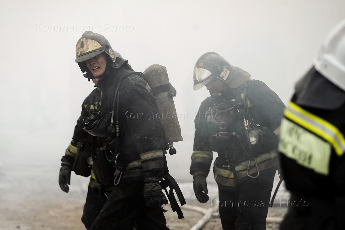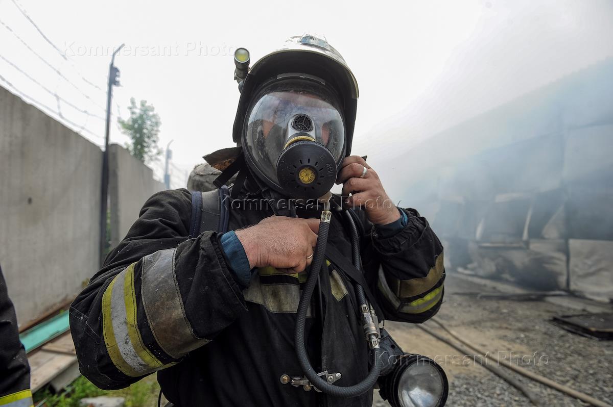 Новосибирск во время режима карантина из-за опасности распространения коронавирусной инфекции COVID-19. Крупный пожар на складе в Заельцовском районе на улице Гипсовая. Жанровая фотография. Сотрудники МЧС России во время ликвидации пожара.