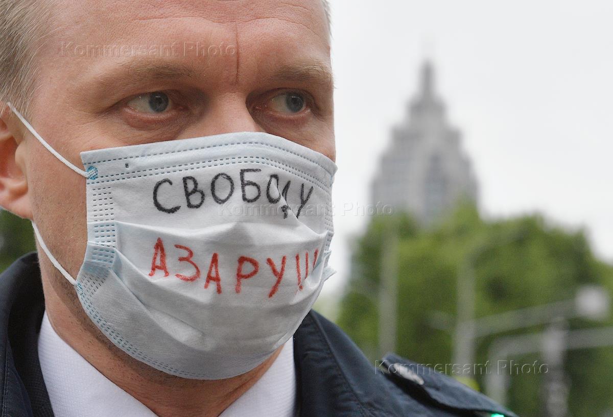 Серия одиночных пикетов против полицейского насилия у здания Главного управления МВД России по городу Москве на улице Петровка, 38. Участник пикета в поддержку журналиста Ильи Азара депутат Московской городской думы Евгений Ступин. Журналист Илья Азар был арестован на 15 суток после одиночного пикета 26 мая в поддержку основателя паблика "Омбудсмен полиции" Владимира Воронцова.