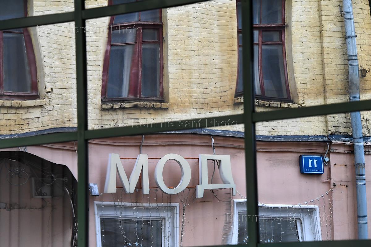 Виды Москвы во время режима самоизоляции из-за опасности распространения коронавирусной инфекции COVID-19. Жанровая фотография. Отражение старого дома в зеркальной стене нового.