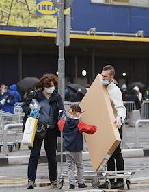 Москва во время режима самоизоляции из-за опасности распространения коронавирусной инфекции COVID-19. Второй этап снятия ограничений, введенных в связи с эпидемией коронавируса. Жанровая фотография. Гипермаркет "ИКЕА Теплый стан" возобновил работу. Покупатели в медицинских масках.