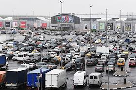Москва во время режима самоизоляции из-за опасности распространения коронавирусной инфекции COVID-19. Второй этап снятия ограничений, введенных в связи с эпидемией коронавируса. Жанровая фотография. Гипермаркеты "ИКЕА и МЕГА Теплый стан" возобновили работу. Автомобильная парковка гипермаркета.