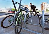 Санкт-Петербург во время режима самоизоляции из-за опасности распространения коронавирусной инфекции COVID-19. Молодой человек забирает свой частный велосипед с велопарковки с прокатными велосипедами