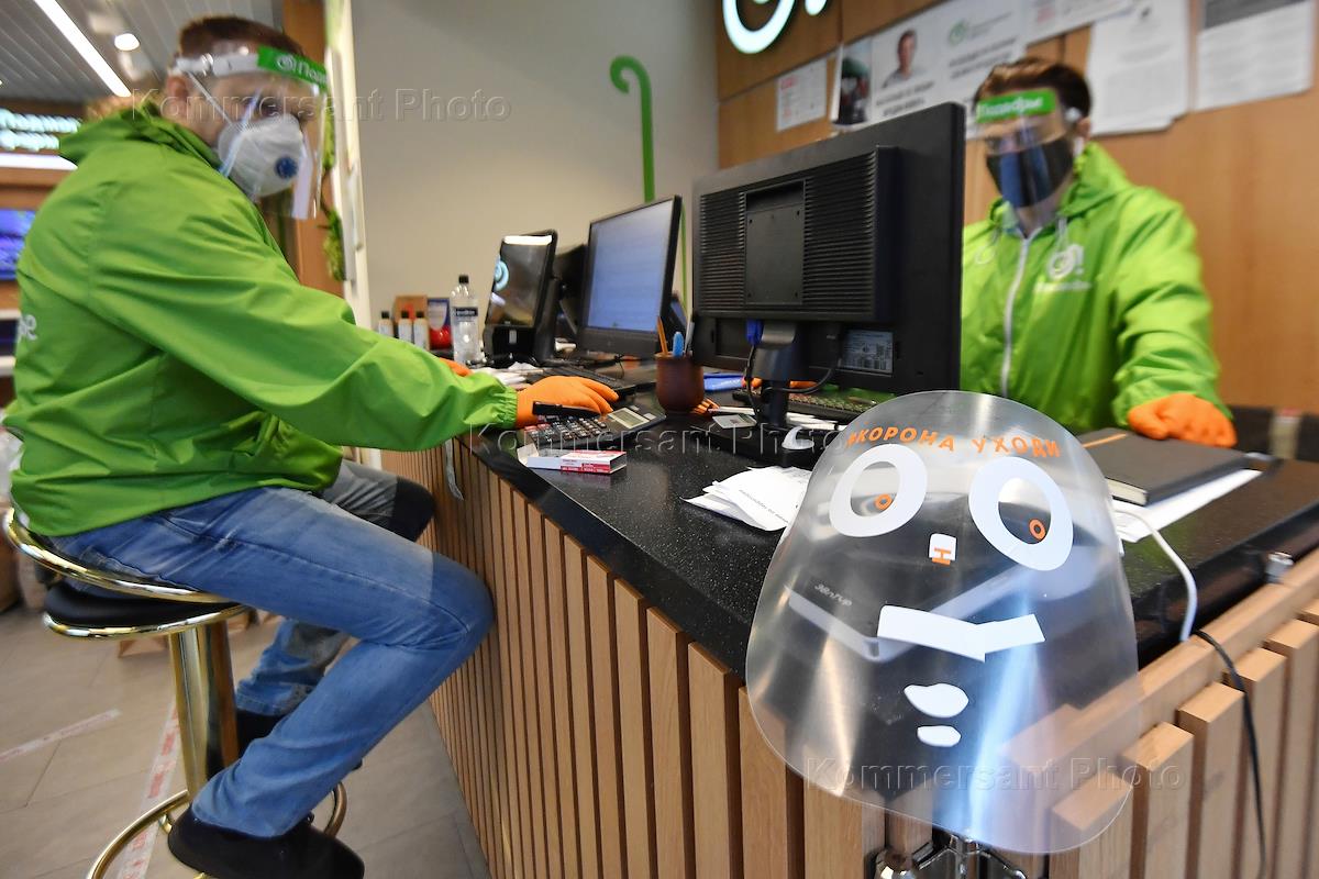 Московская область во время режима самоизоляции из-за опасности распространения коронавирусной инфекции COVID-19. Снятие ограничений, введенных в связи с эпидемией коронавируса. Жанровая фотография. Сотрудники торгового центра "Подмосковный фермер" в респираторах и защитных экранах во время работы.