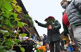 Московская область во время режима самоизоляции из-за опасности распространения коронавирусной инфекции COVID-19. Снятие ограничений, введенных в связи с эпидемией коронавируса. Жанровая фотография. Покупатели и продавцы в медицинских масках на рынке. Продажа цветов и растений для дачи.