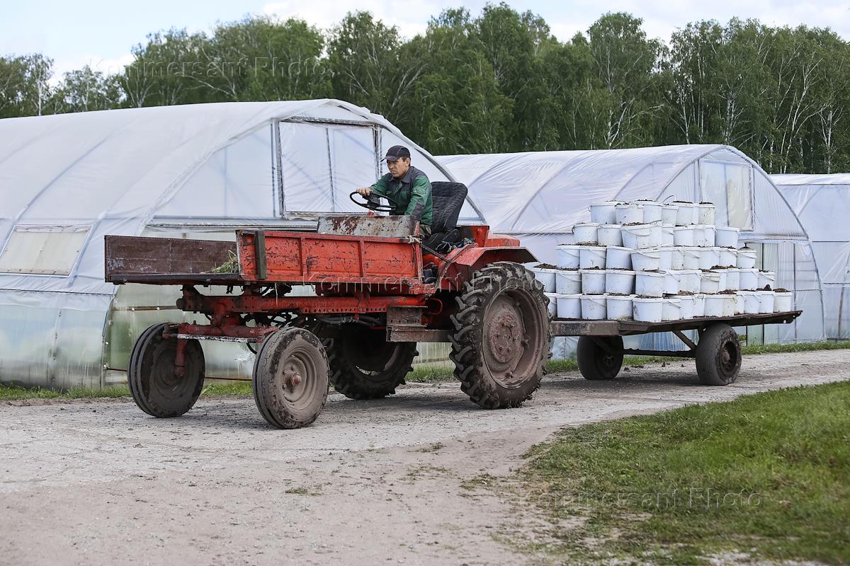 Работа сельскохозяйственного предприятия "Мичуринец" в Новосибирской области. Сотрудник предприятия везет на тракторе контейнеры с будущей рассадой.