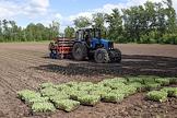 Работа сельскохозяйственного предприятия "Мичуринец" в Новосибирской области. Жанровая фотография. Сотрудники передают друг другу поддоны с рассадой во время высадки саженцев цветной капусты на полях в деревне Издревая.
