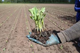 Работа сельскохозяйственного предприятия "Мичуринец" в Новосибирской области. Рабочий держит в руках саженцы цветной капусты во время механизированной посадки рассады цветной капусты на полях в деревне Издревая.