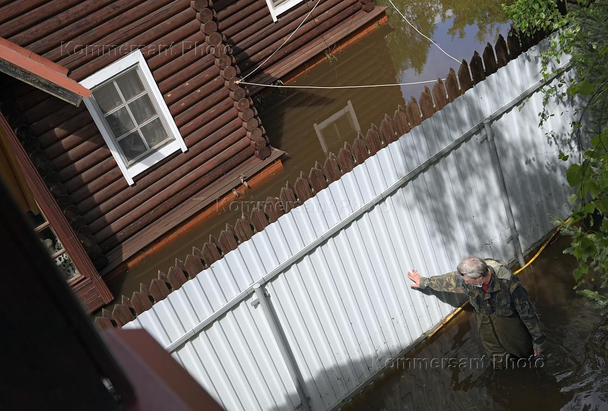 Последствия ливневого дождя в Московской области. Подтопленные садовые участки в Щелковском районе. Жанровая фотография. Мужчина стоит в воде на затопленном участке.