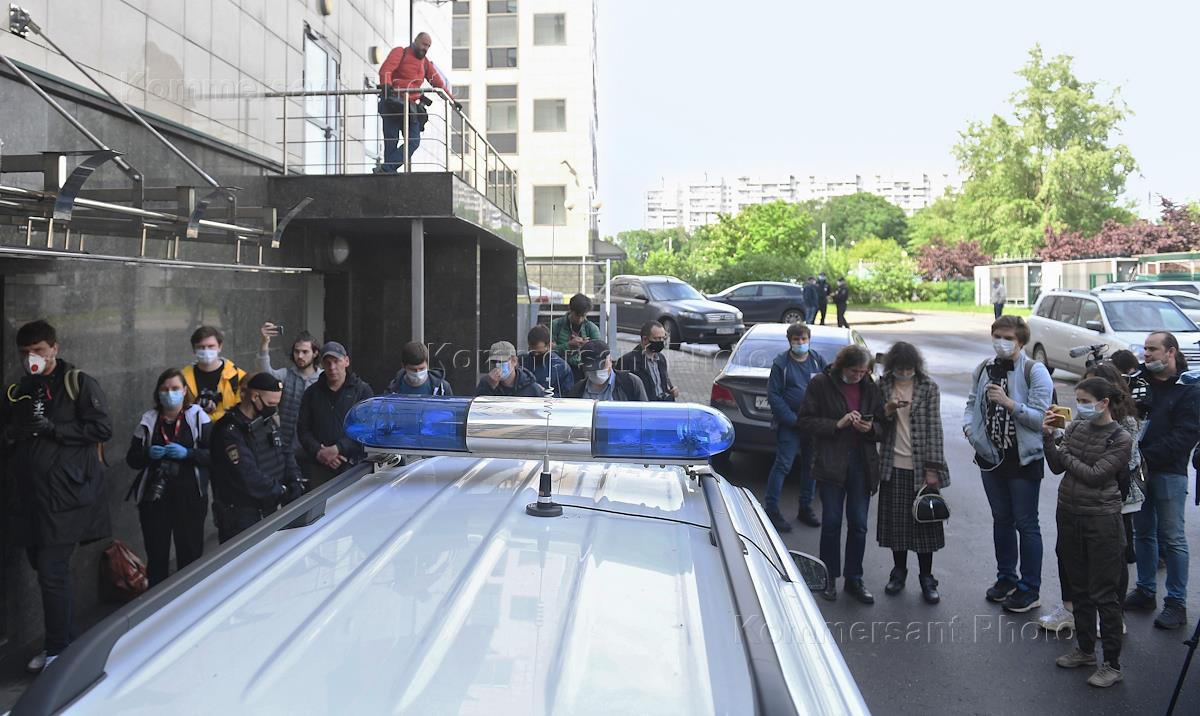 Журналисты у здания Московского городского суда, где проходит рассмотрение жалобы на административный арест журналиста Ильи Азара. Журналист Илья Азар был арестован на 15 суток после одиночного пикета 26 мая в поддержку основателя паблика "Омбудсмен полиции" Владимира Воронцова.