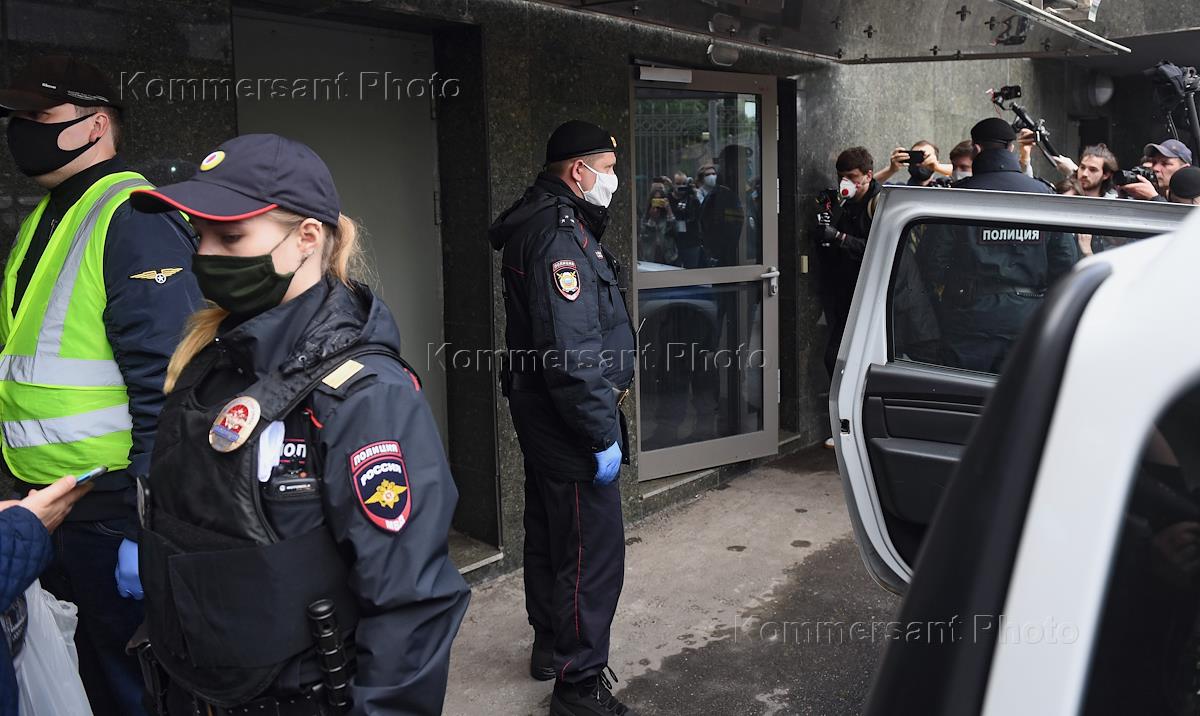 Сотрудники полиции в медицинских масках у здания Московского городского суда, где проходит рассмотрение жалобы на административный арест журналиста Ильи Азара. Журналист Илья Азар был арестован на 15 суток после одиночного пикета 26 мая в поддержку основателя паблика "Омбудсмен полиции" Владимира Воронцова.