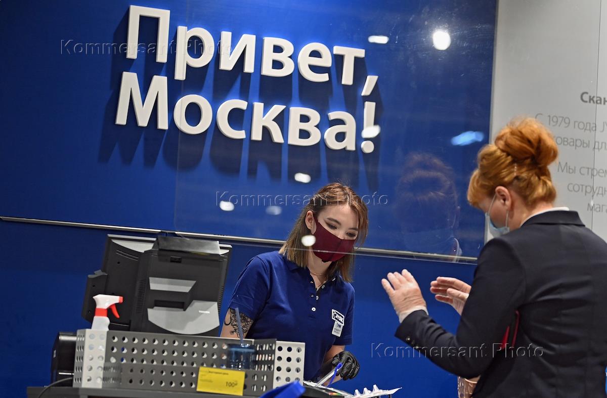 Москва во время режима самоизоляции из-за опасности распространения коронавирусной инфекции COVID-19. Начало второго этапа снятия ограничений, введенных в связи с эпидемией коронавируса. Жанровая фотография. Открытие датского магазина товаров для дома JYSK в торговом центре (ТЦ) "Тройка". Продавец и покупательница в медицинских масках в салоне магазина.
