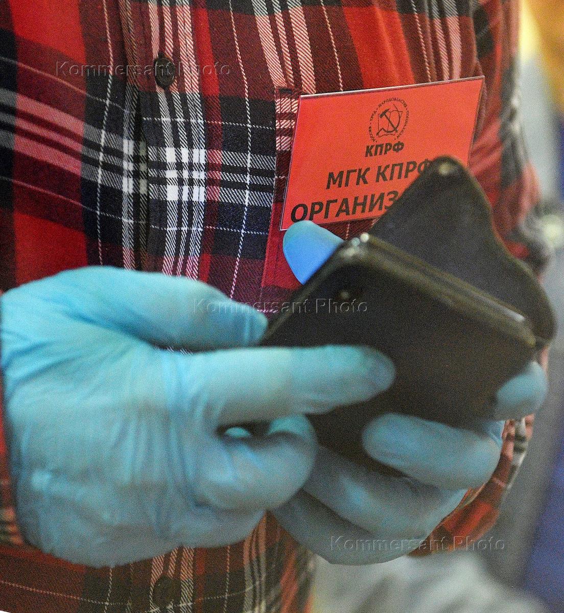 Москва во время режима самоизоляции из-за опасности распространения коронавирусной инфекции COVID-19. Второй этап снятия ограничений, введенных в связи с эпидемией коронавируса. Заседание Пленума МГК КПРФ в гостинице "Измайлово" в закрытом режиме. Жанровая фотография. Руки в резиновых перчатках с телефоном.
