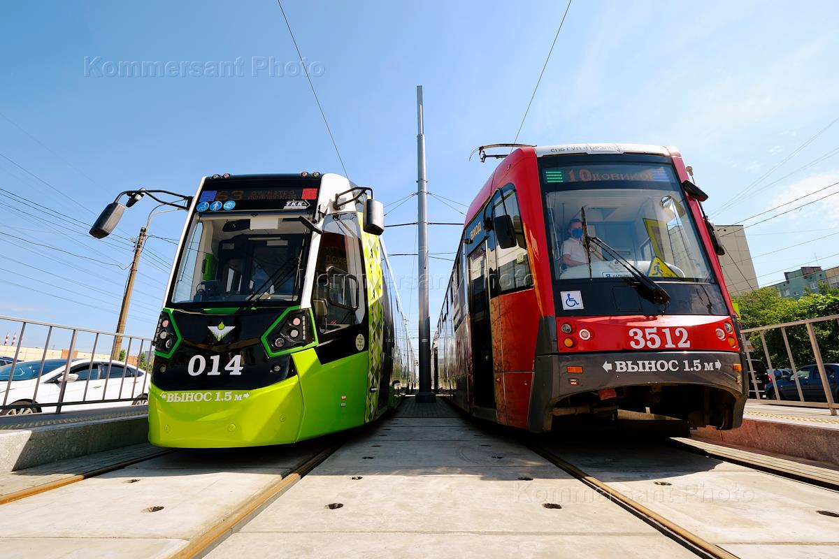 Церемония открытия рабочего движения продленного маршрута трамвая №10 по улице Передовиков. Накануне петербургский Горэлектротранс подписал договор с ООО "Транспортная концессионная компания" о совместном использовании двух участков трамвайной сети в Красногвардейском районе. Благодаря этому, пассажиры трамвая №10 государственного перевозчика смогут пересесть на трамвайный маршрут №63 ("Чижик"). Директор ООО "ТКК" Сергей Окутин (слева) и директор СПб ГУП "Горэлектротранс" Денис Минкин (справа) во время церемонии.
