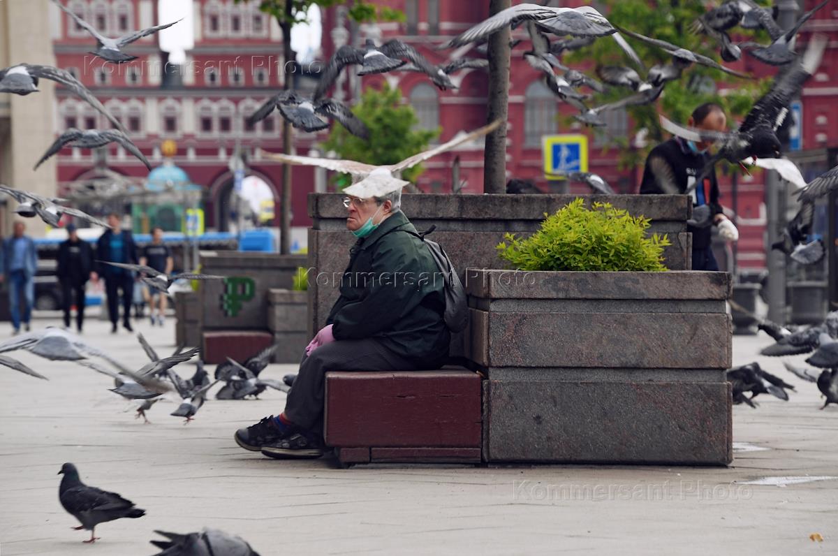 Moscow during self-isolation regime caused by the danger of the coronavirus COVID-19 spread. Second stage of removal of coronavirus restrictions. Genre photo. Elderly man wearing face mask sits on a bench on Tverskaya Street.
